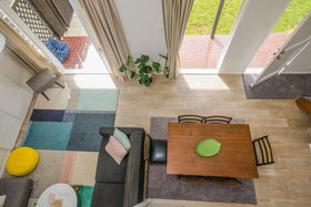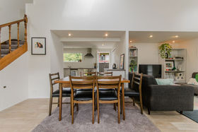 Entering this mezzanine style home your eye is taken by the light filled modern decor with a contemporary feel, open-plan kitchen, dining and lounge with French doors which extend to a pleasant garden and level lawn. A generous downstairs bedroom and bathroom offers a versatile space with sliding doors which could be opened up to create a second living space, on the mezzanine level there are two further bedrooms and bathroom.