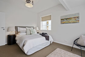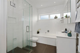 Three bedrooms plus a generous modern tiled bathroom with a large glass shower and separate bath.