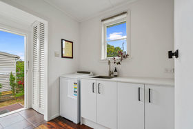 The stylish well-designed kitchen with a central island has been a delight to work in, with an abundance of storage and modern appliances, the heart of many social gatherings with family and friends and overlooks the rata tree, currently in flower.